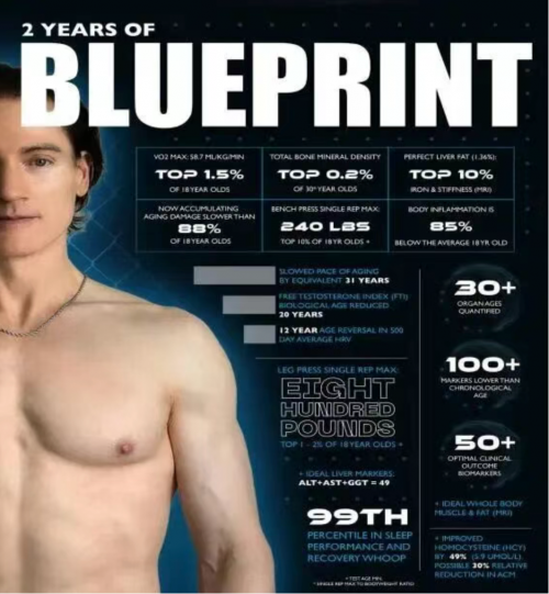 峰会现场,Bryan Johnson毫无保留地分享了他闻名全球的“蓝图计划(Blueprint)”。这位每年豪掷200万美元、拥有30人顶尖医疗团队的硅谷富豪,用近乎“反人性”的自律向世界展示了逆转生物钟的极限: